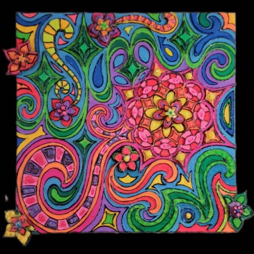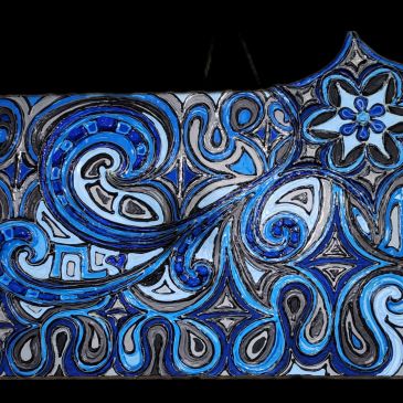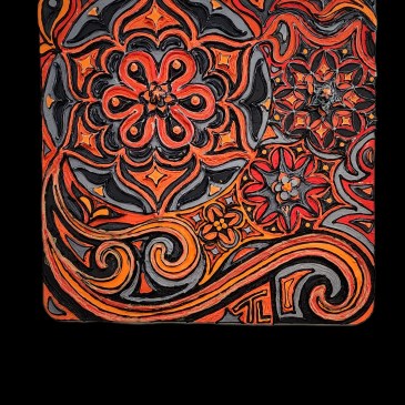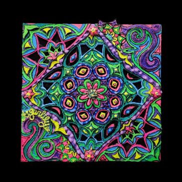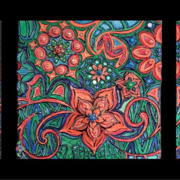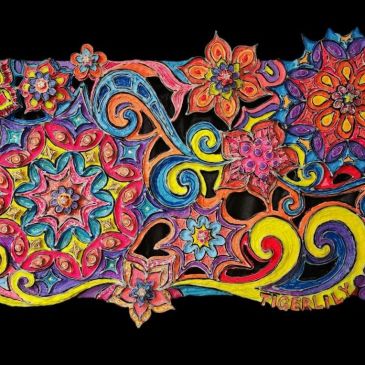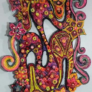 $525 15×30″ Created on stretched canvas using multi-media techniques starting with: hand-mixed, high-quality fluorescent oil paint (from fluorescent mica powder pigments) with glow-in-the-dark and mixed-media 3-dimensional accents (such as hand-made clay designs suspended with wire inside of the many intricate designs that are cut out of the canvas). All 3-Dimensional details are crafted with durability … More “Passion”