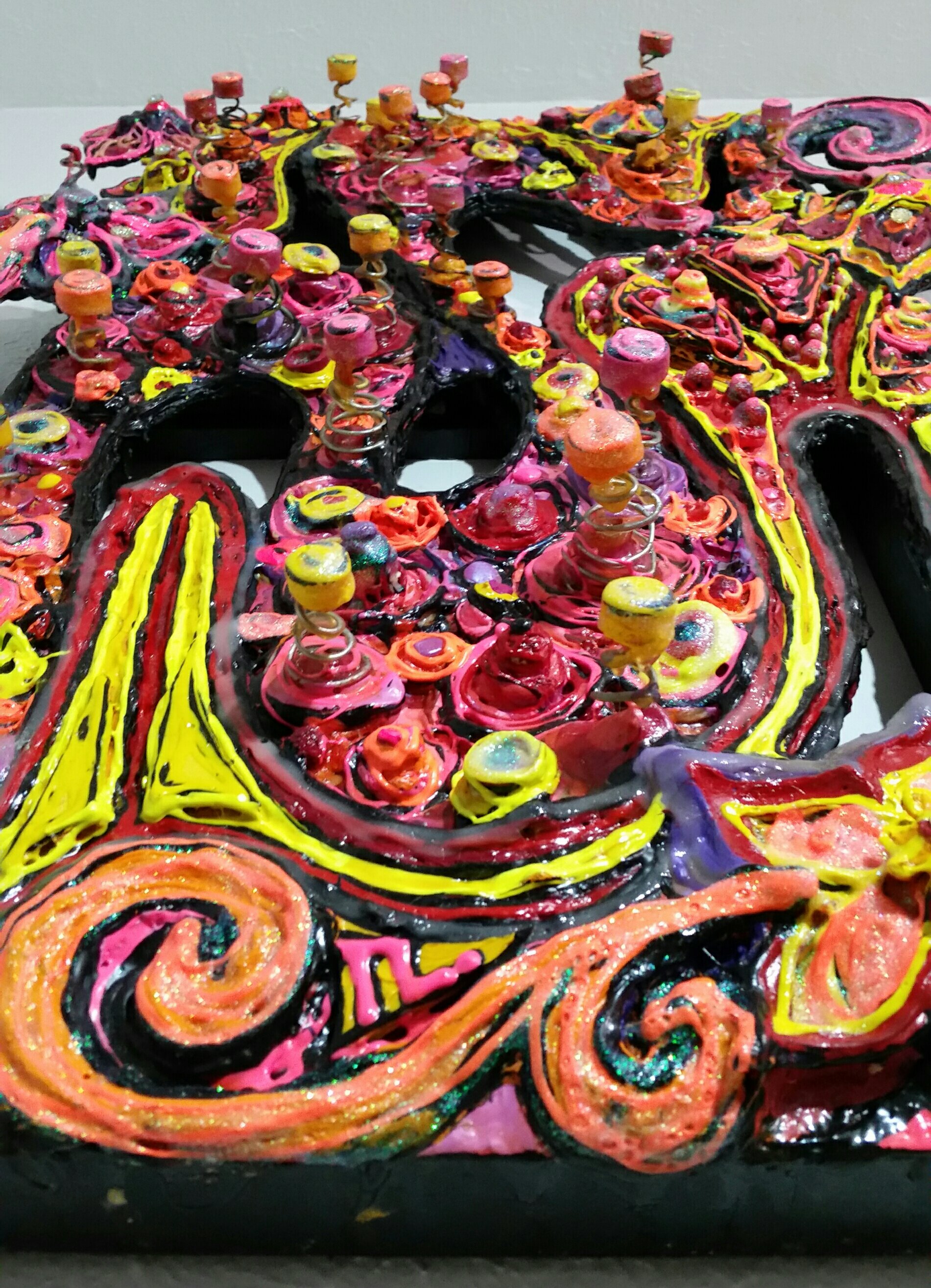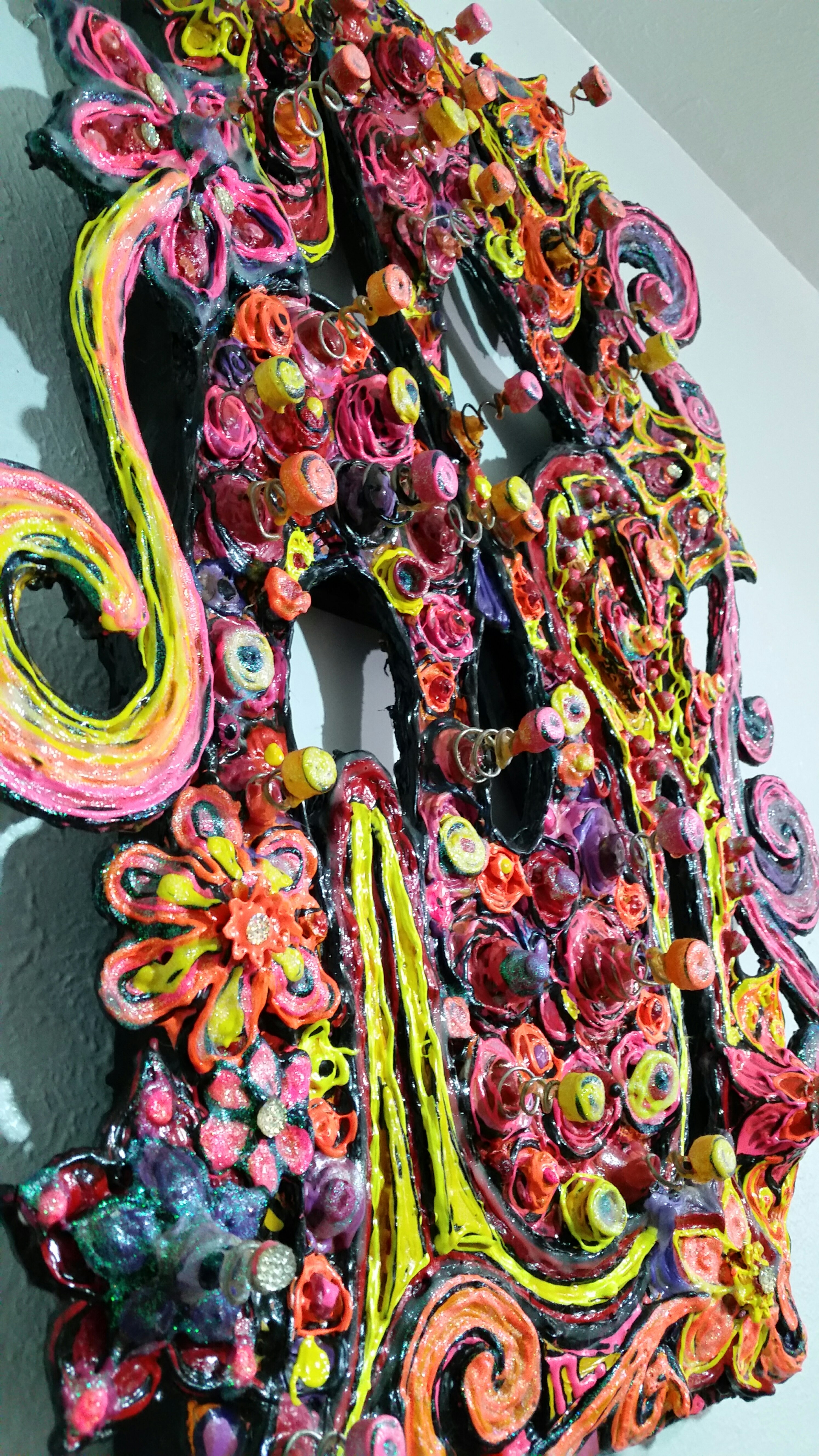15 x 30" fluorescent oil painting with dimensional mixed-media accents and glow-in-the-dark details. Cutouts in canvas create another level of dimensional interest. I mix all paints myself from high quality fluorescent powder pigments. All 3-Dimensional details are crafted with durability and longevity in mind and are not fragile or at risk of breaking easily.