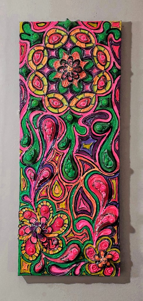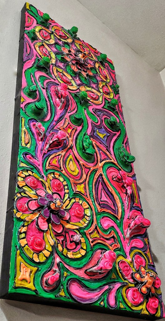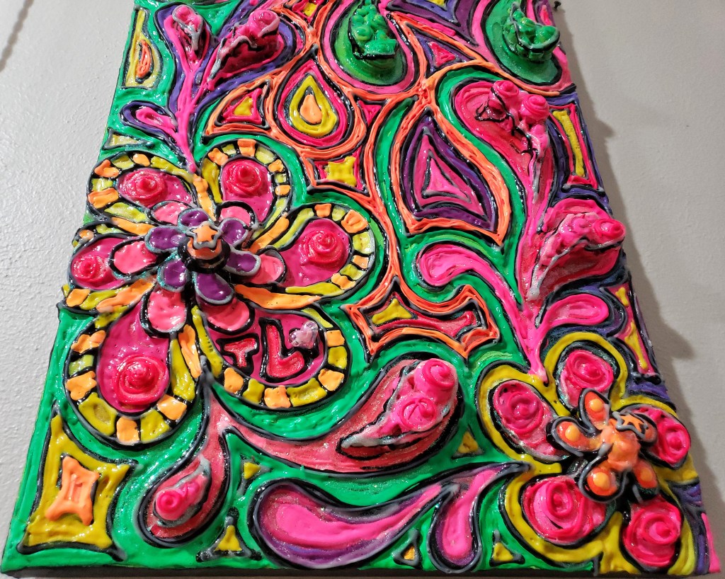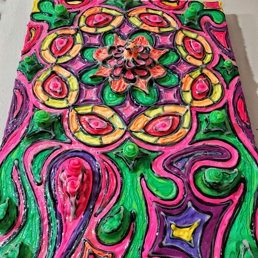 16 x 40" fluorescent oil painting with dimensional mixed-media accents and glow-in-the-dark details. I mix all paints myself from high quality fluorescent powder pigments. All 3-Dimensional details are crafted with durability and longevity in mind and are not fragile or at risk of breaking easily. This piece was initially an exploration and challenge to myself to create a beautiful piece using a more unconventional and limited selection of colors than I usually prefer to use. Limiting myself to a pallet of 4 colors (Pink, Green, Purple, and Yellow) can begin to get difficult when trying to make such an intricate design. I was happy to see the finished piece and now enjoy the challenge of creating my works with specific color schemes in mind.