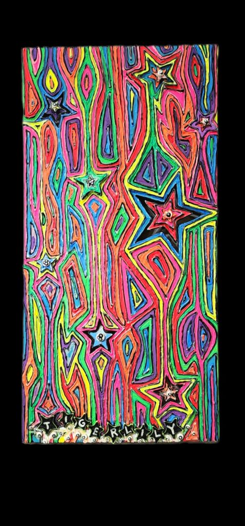 Fluorescent oil painting with dimensional mixed-media accents and glow-in-the-dark details. I mix all paints myself from high quality fluorescent powder pigments. All 3-Dimensional details are crafted with durability and longevity in mind and are not fragile or at risk of breaking easily.