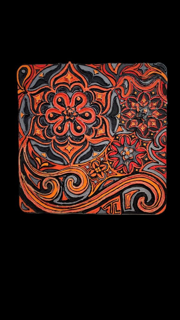 Hand-mixed, high-quality fluorescent oil paint (from fluorescent mica powder pigments) with glow-in-the-dark and mixed-media accents (ranging from air-dry & polymer clay, archival foam board, and yarn).